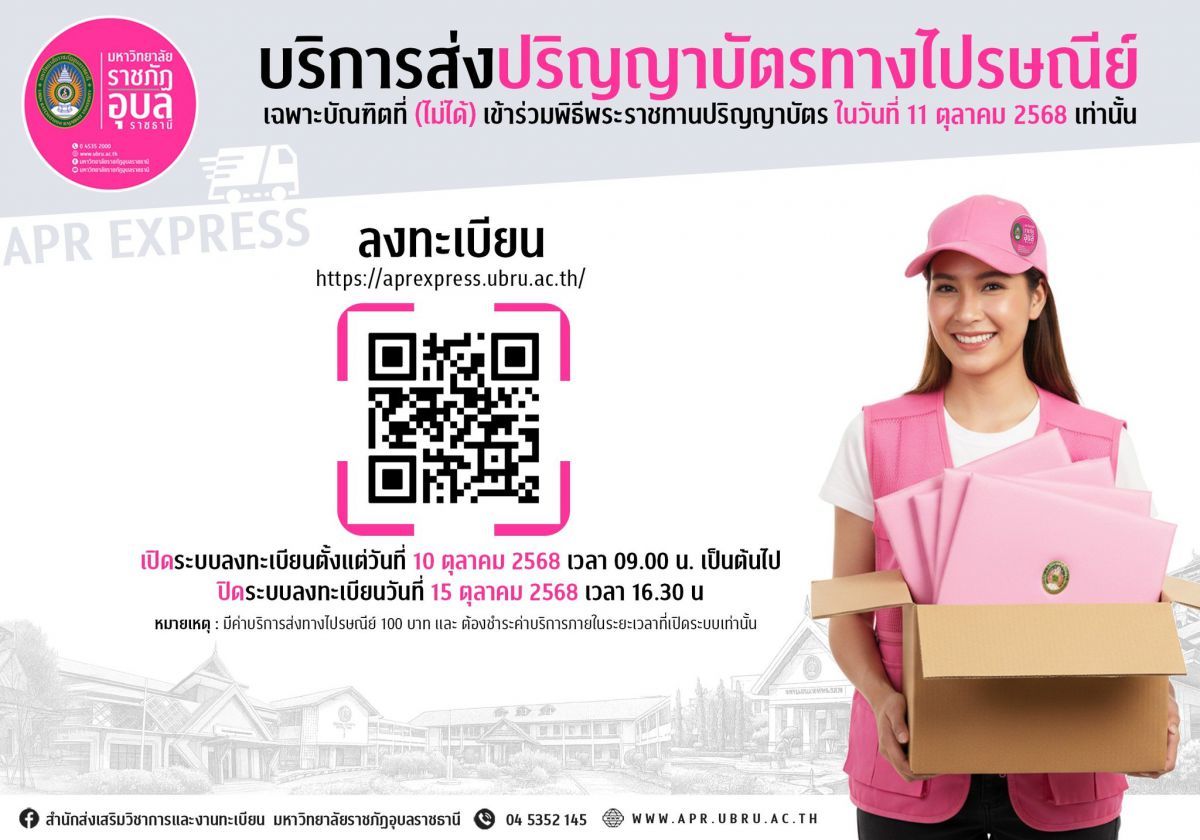 ปิดระบบลงทะเบียน : 15 ต.ค. 68 เวลา 16.30 น. ระบบลงทะเบียน aprexpress.ubru.ac.th หมายเหตุ: มีค่าธรรมเนียมจัดส่งคนละ 100 บาท สำหรับท่านใดที่มีความประสงค์จะรับด้วยตนเอง สามารถมารับใบปริญญาบัตรได้ที่สำนักส่งเสริมฯ ตั้งแต่วันที่ 20 ตุลาคม 2568 เป็นต้นไป