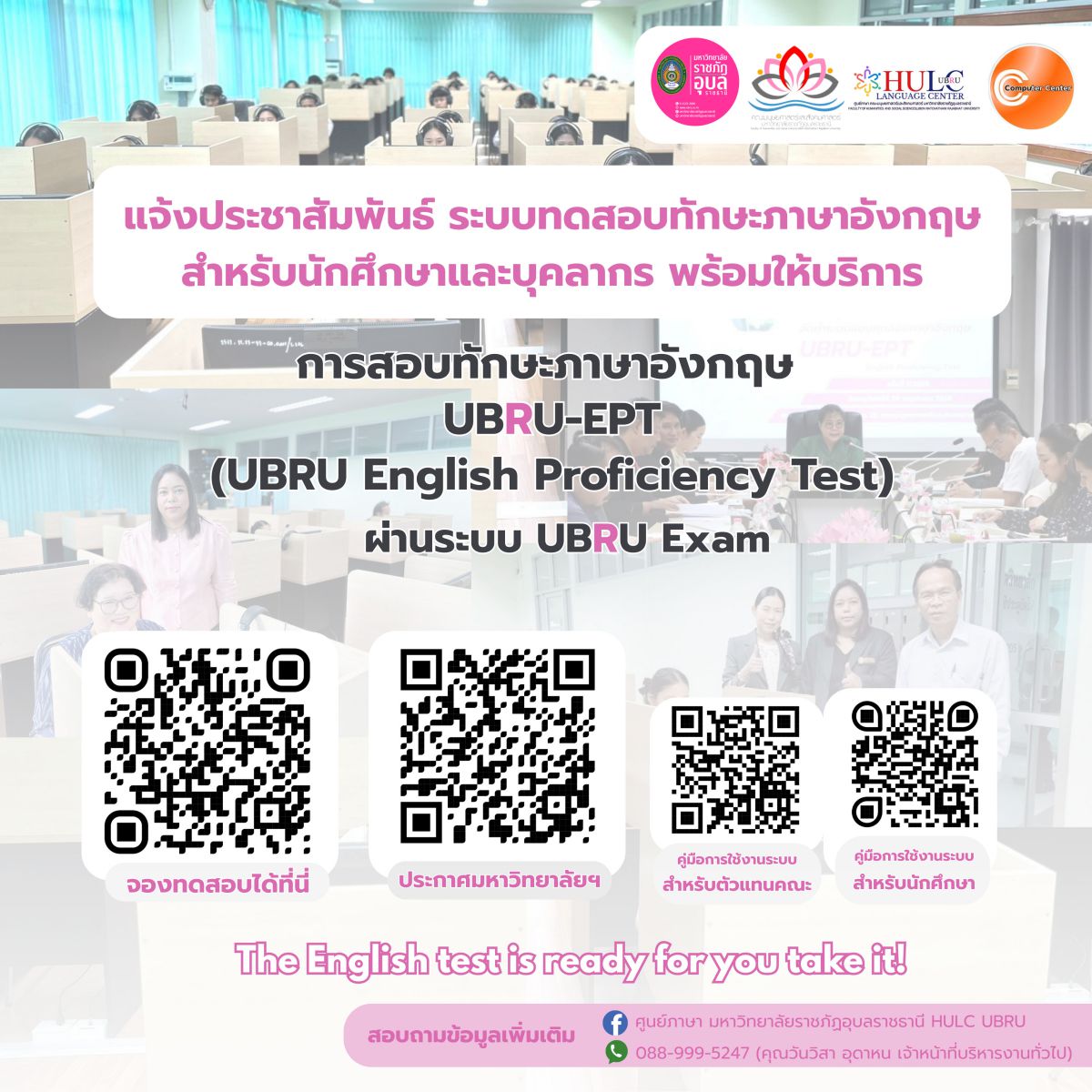 แจ้งประชาสัมพันธ์ ระบบทดสอบทักษะภาษาอังกฤษสำหรับนักศึกษาและบุคคลากรพร้อมให้บริการ ศูนย์ภาษา คณะมนุษยศาสตร์และสังคมศาสตร์และศูนย์คอมพิวเตอร์ สำนักงานอธิการบดี ได้พัฒนาระบบทดสอบทักษะภาษาอังกฤษสำหรับนักศึกษาและบุคลากร เพื่อมุ่งเน้นการพัฒนาทักษะภาษาอังกฤษให้สอดคล้องกับนโยบายการยกระดับมาตรฐานภาษาอังกฤษ มหาวิทยาลัยราชภัฏอุบลราชธานี พ.ศ. 2567 คณะที่สนใจจัดสอบให้แก่นักศึกษา สามารถ จองวันและเวลาสอบ ได้ที่ จองทดสอบได้ที่ https://ubru-ept.ubru.ac.th/ ประกาศมหาวิทยาลัยฯ https://shorturl.asia/MpRX8 คู่มือการใช้งานระบบ https://ubru-ept.ubru.ac.th/Home/Manual รายละเอียดการใช้งานระบบ สามารถดูได้ที่เว็บไซต์หรือสแกน QR Code ที่แนบมา สอบถามเพิ่มเติม: คุณวันวิสา อุดาหน