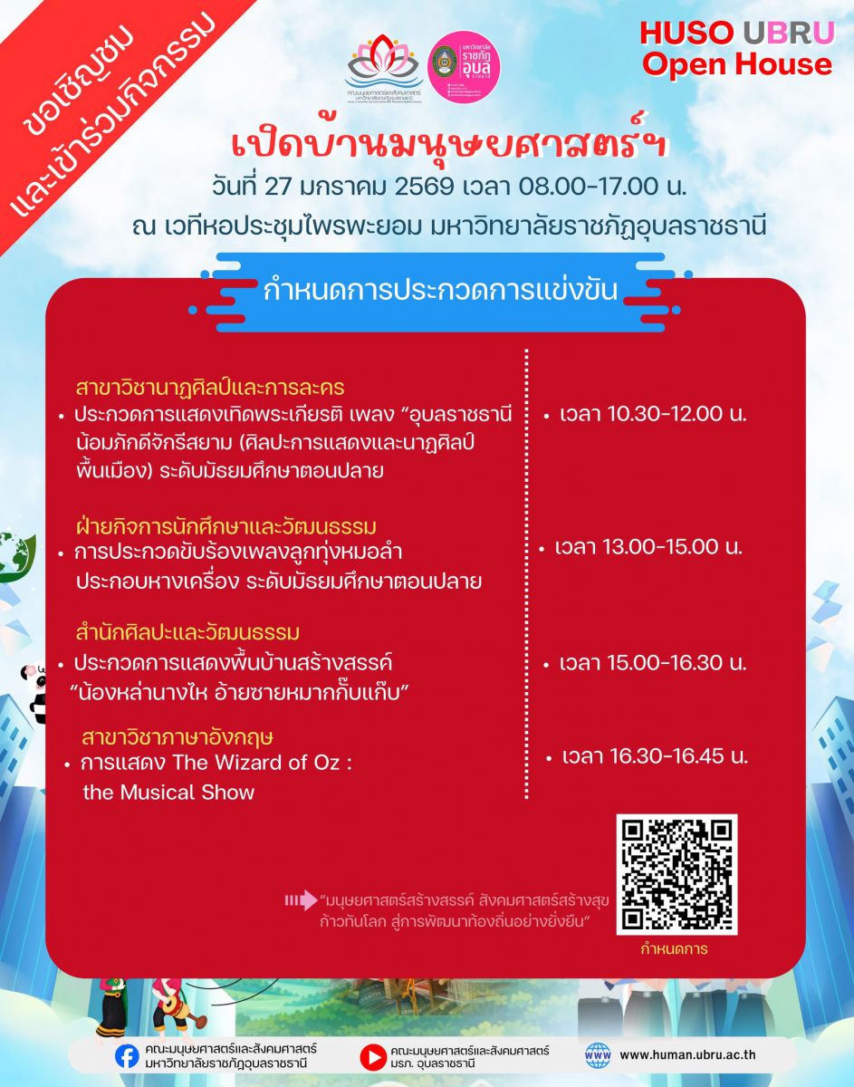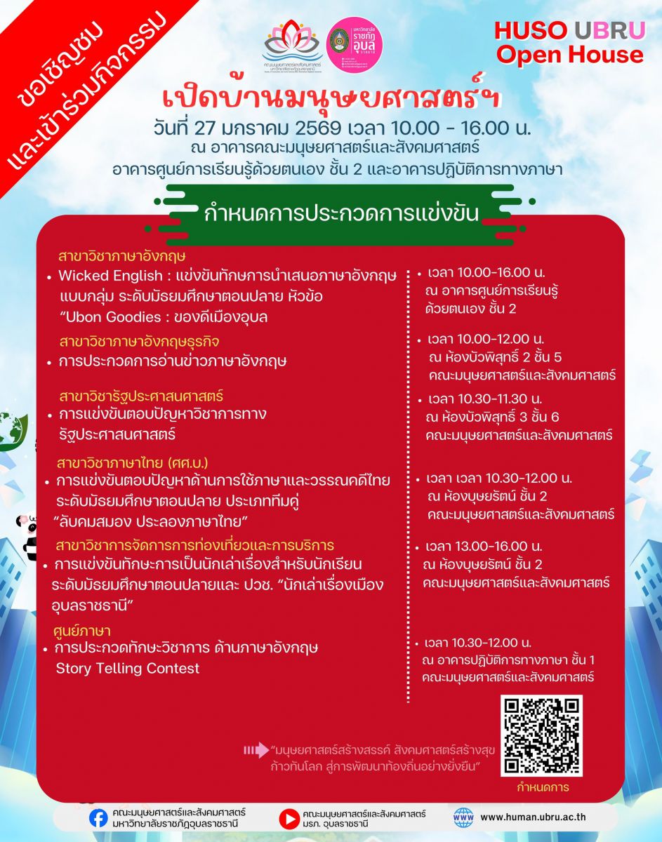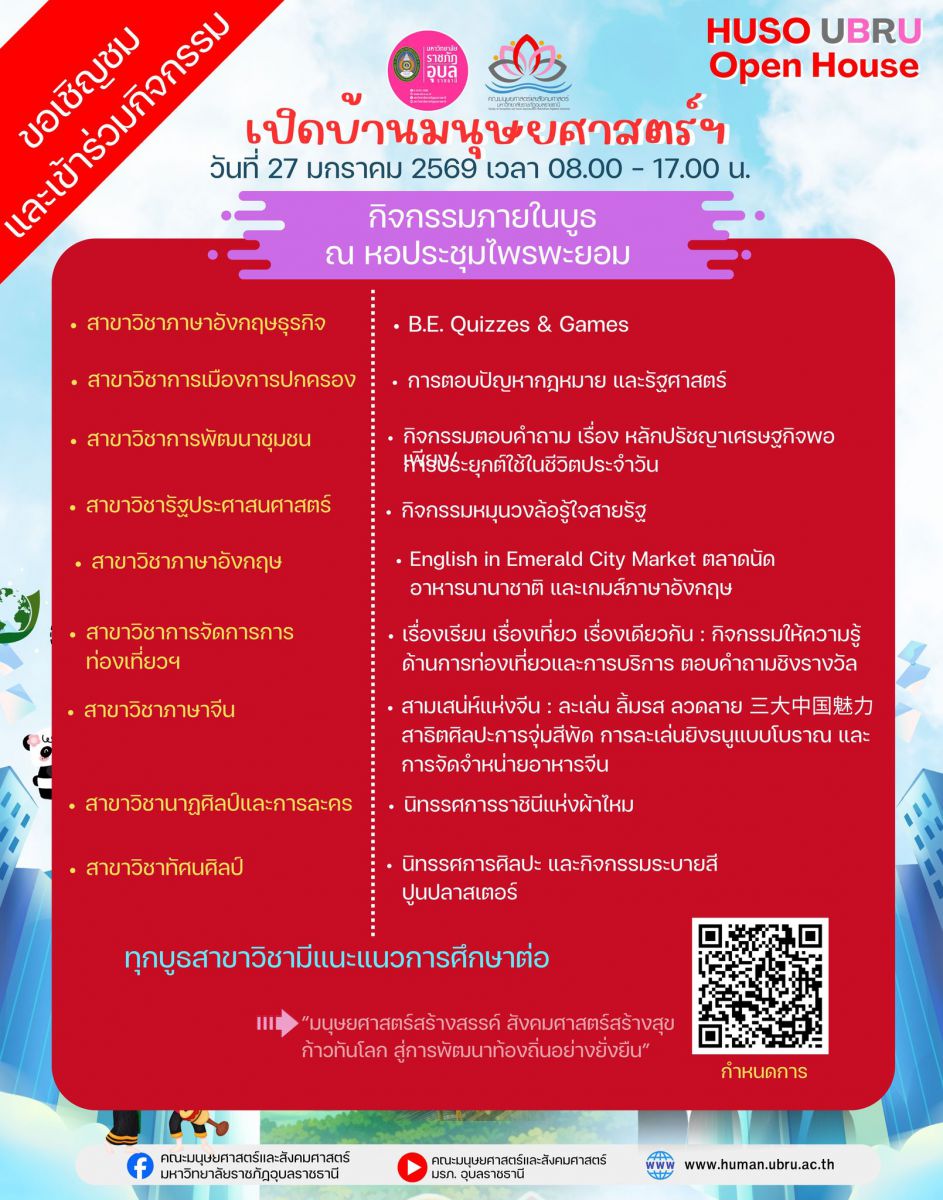 #กำหนดการการแข่งขันทักษะวิชาการและวิชาชีพ #กิจกรรมในบูธสาขาวิชา ขอเชิญชม ให้กำลังใจ และร่วมกิจกรรม ในงาน HUSO UBRU Open House เปิดบ้านมนุษยศาสตร์ฯ “มนุษยศาสตร์สร้างสรรค์ สังคมศาสตร์สร้างสุข ก้าวทันโลก สู่การพัฒนาท้องถิ่นอย่างยั่งยืน” วันที่ 27 มกราคม 2569 ณ หอประชุมไพรพะยอม มหาวิทยาลัยราชภัฏอุบลราชธานี อาคารคณะมนุษยศาสตร์และสังคมศาสตร์ และ อาคารศูนย์การเรียนรู้ด้วยตนเอง ชั้น 2 ภายในหอประชุมไพรพะยอม มหาวิทยาลัยราชภัฏอุบลราชธานี มีบูธกิจกรรมของทุกสาขาวิชา ระดับปริญญาตรี จำนวน 16 สาขาวิชา โดยมีกิจกรรมแนะแนวการศึกษาต่อระดับปริญญาตรี เกมด้านทักษะวิชาการแข่งขันชิงรางวัล กิจกรรมด้านวัฒนธรรม การแสดงผลงานด้านวิจัยและบริการวิชาการ ขายสินค้าชุมชน อาหาร เครื่องดื่ม เป็นต้น
