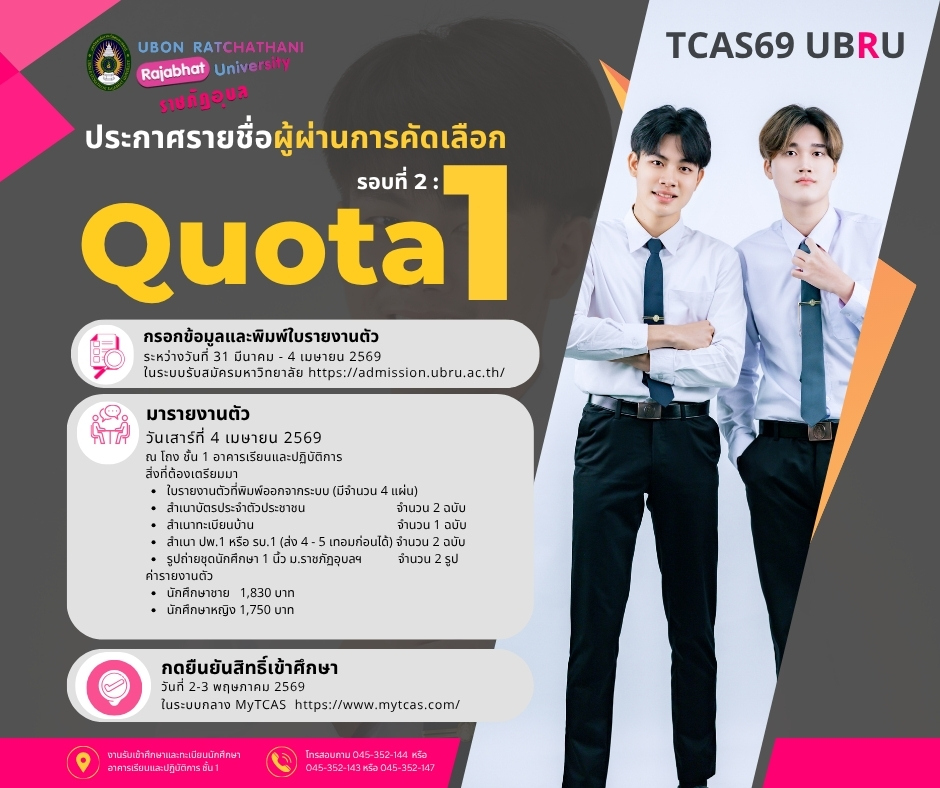ประกาศรายชื่อผู้ผ่านการคัดเลือก ระดับปริญญาตรี ภาคปกติ ปีการศึกษา 2569 รอบที่2 : Quota1 โควตาพื้นที่ภาคตะวันออกเฉียงเหนือ (โรงเรียน/ภูมิลำเนา) ตรวจสอบรายชื่อผู้ผ่านการคัดเลือก คลิกเพื่อตรวจสอบรายชื่อ https://qrcd.org/9rFk