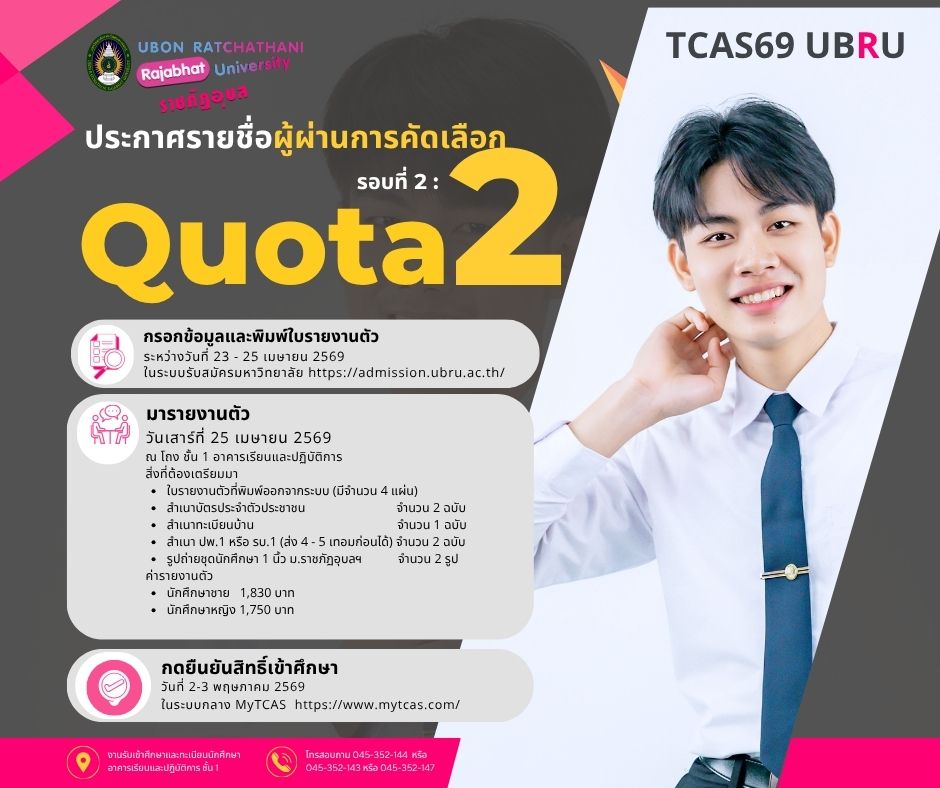 ประกาศรายชื่อผู้ผ่านการคัดเลือก ระดับปริญญาตรี ภาคปกติ ปีการศึกษา ๒๕๖๙ รอบที่ ๒ : Quota 2 โควต้าพื้นที่ภาคตะวันออกเฉียงเหนือ (โรงเรียน/ภูมิลำเนา)ตรวจสอบรายชื่อผู้ผ่านการคัดเลือก คลิกเพื่อตรวจสอบรายชื่อ https://drive.google.com/.../1dZhZw4UPHRSHahJiAKUGsjZmSI... ผู้มีรายชื่อเข้ากรอกข้อมูลการรายงานตัวและพิมพ์ใบรายงานตัว คลิกเพื่อตรวจสอบรายชื่อ https://admission.ubru.ac.th/ เริ่มเข้าระบบได้วันศุกร์ที่ 24 เมษายน 2569 เวลา 13.00 น. วันรายงาน วันเสาร์ที่ 25 เมษายน 2569 เวลา 09.00 – 11.30 น. โถงชั้น 1 อาคารเรียนและปฏิบัติการ ผู้ที่มีรายชื่อรายงานตัว ต้องลงทะเบียนเข้าใช้งานระบบ TCAS69 เพื่อรอยืนยันสิทธิ์ www.mytcas.com ยืนยันสิทธิ์เข้าศึกษาในระบบ TCAS69 วันที่ 2 – 3 พฤษภาคม 2569 หลังจากยืนยันสิทธิ์แล้ว โปรดรอติดตามกำหนดการ ปฐมนิเทศนักศึกษาใหม่ และกำหนดการเปิดภาคการศึกษา (เปิดเทอม) ในเดือนมิถุนายน 2569